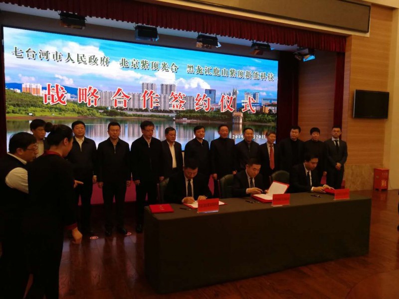 2019年1月20日上午,七臺(tái)河市人民政府、北京紫頂光合企業(yè)管理中心(有限合伙)、黑龍江鹿山紫頂新能科技有限公司簽約儀式在市專家接待中心舉行。市委書記楊廷雙,市委副書記、市長(zhǎng)賈君,市委常委、秘書長(zhǎng)蔣和慶,市政府副市長(zhǎng)王義光,市政府秘書長(zhǎng)陳志、鹿山集團(tuán)鐘金海等領(lǐng)導(dǎo)出席簽約儀式。市委常委、副市長(zhǎng)安虎賁主持簽約儀式。